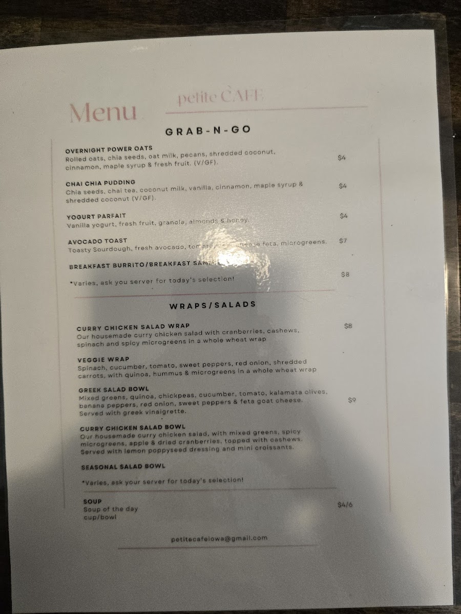 Welcome to Petite Cafe, a delightful sanctuary nestled in the heart of Winterset, IA. This charming eatery offers a curated menu that beautifully showcases fresh, wholesome ingredients. Start your day with a delicious Breakfast Burrito or indulge in a vibrant Avocado Toast. The cafe's signature Chai Chia Pudding and Overnight Power Oats are a must-try for a nutritious kick.
